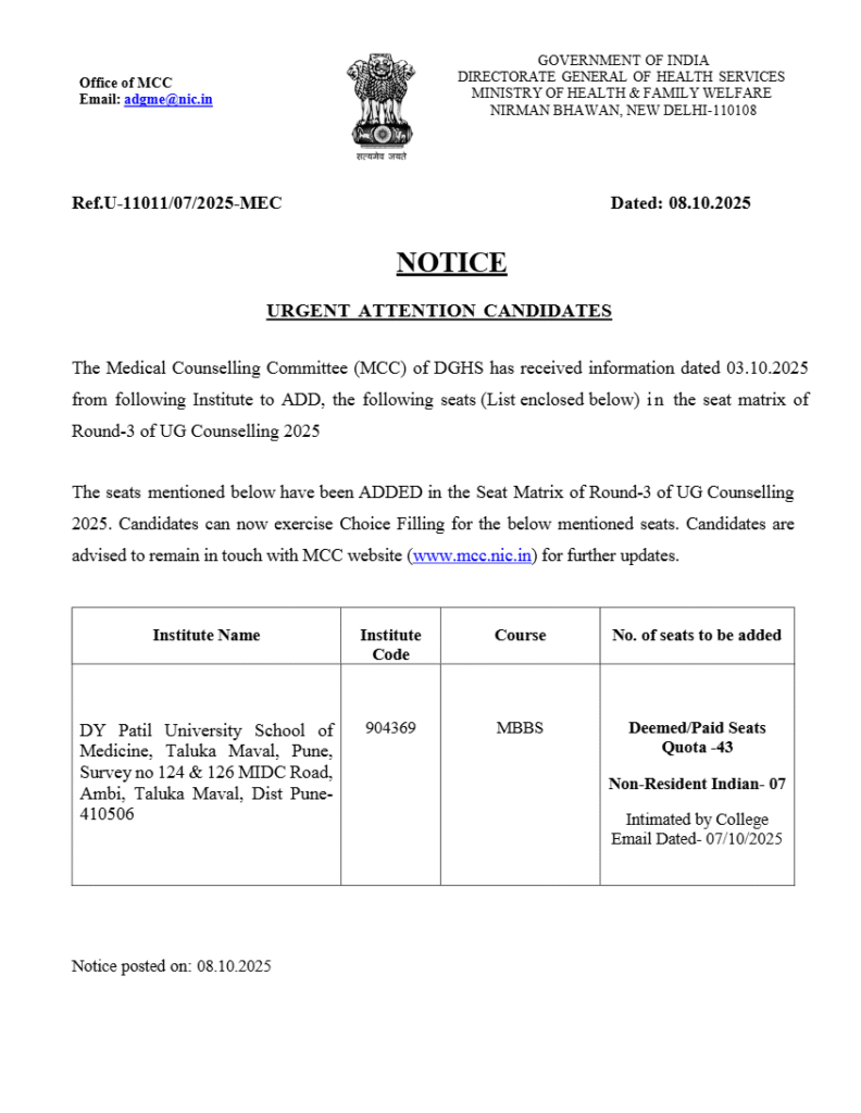 - MCC ने 8 अक्टूबर 2025 को एक नोटिफिकेशन जारी किया है जिसमें कहा गया है कि राउंड-3 काउंसलिंग के लिए सीटों में वृद्धि की गई है।